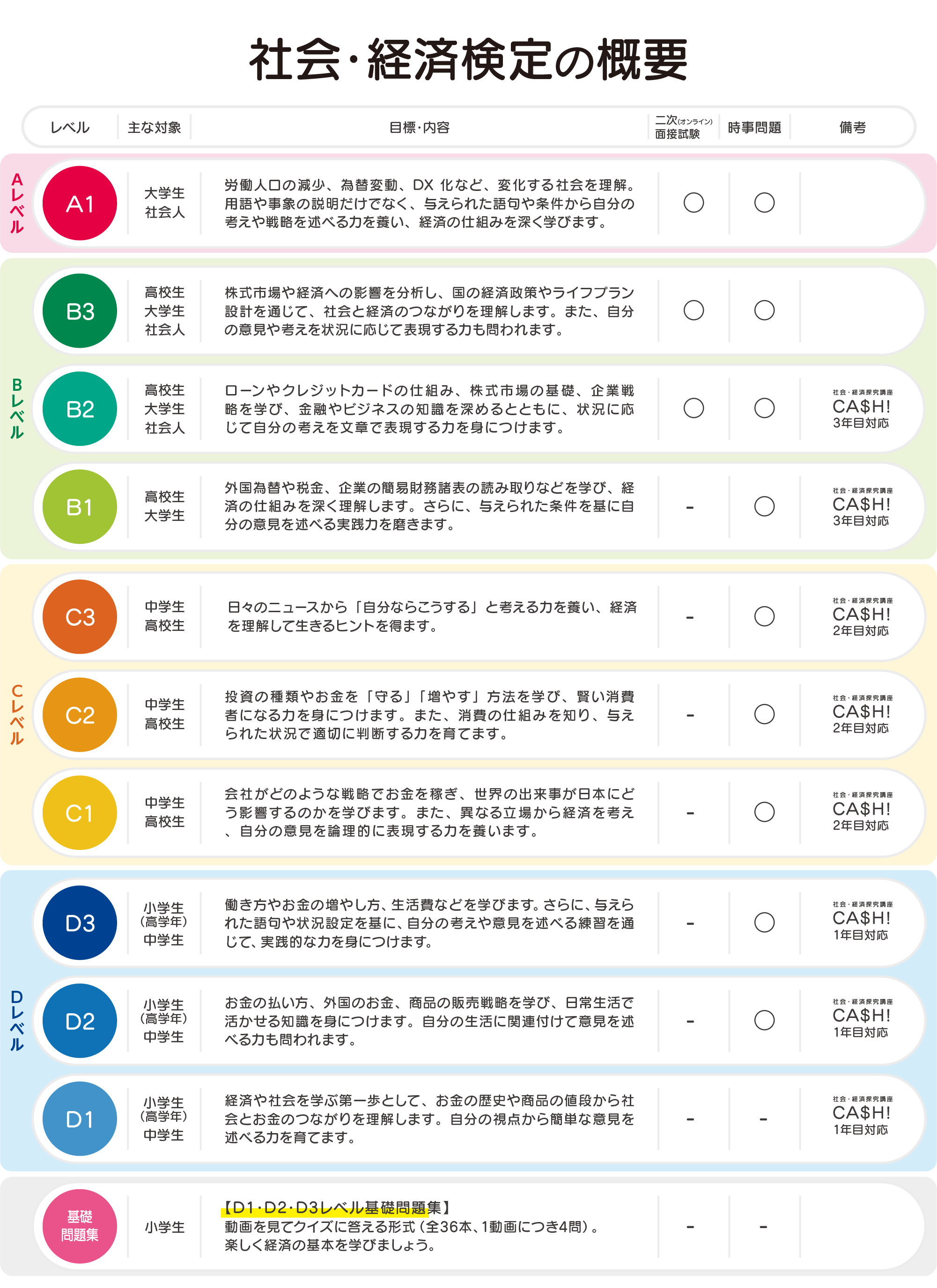 | D1 | 小学生 (高学年) 中学生 | 経済や社会を学ぶ第一歩として、お金の歴史や商品の値段から社会とお金のつながりを理解します。自分の視点から簡単な意見を述べる力を育てます。 | - | - | 社会・経済探究講座 CA$H! 1年目 対応 |